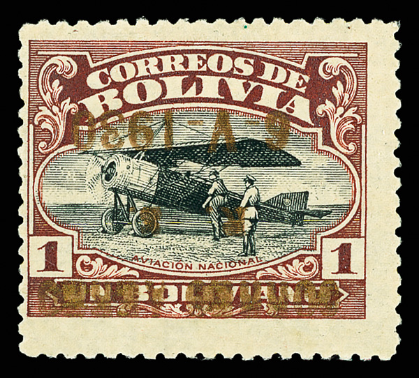 1930, 1b red brown & black Graf Zeppelin issue, gold overprint inverted (Scott C23a), o.g., lightly hinged, Post Office fresh with bold color and clean impression, the gold readily visible, Fine to Very Fine, only 25 examples known. Scott $2,800. (Image)
