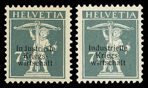 War Board of Trade, 1918, 3c-30c Overprints (Scott 1O1-8, 1O3a), full set which includes the 7½c type I and II overprints, pristine o.g., NH, fresh and Fine to Very Fine, a scarce set; 1O3a, 1O7 each signed Brun. Michel 1I-8I, 3I III. Zumstein 1-8, 3a; SFr 3,680 ($3,650). (Image)