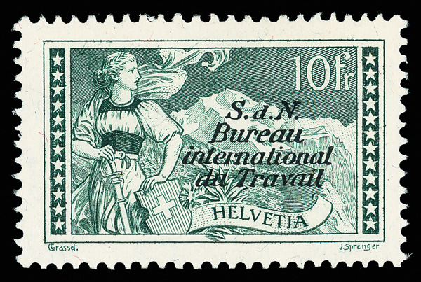 Intl. Labor Bureau, 1923, 1fr-10fr (Scott 3O22-26), bright colors, o.g. with the 3fr and both 10fr very lightly hinged, Very Fine; 5fr signed Bloch, 10fr green signed Brun. Zumstein 11-14, 30; SFr 1,900 ($1,880). (Image)