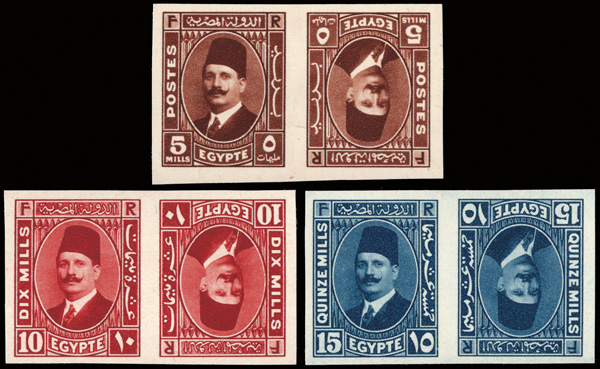 1927, King Fuad, 5m, 10m & 15m, imperf tête-bêche pairs (Scott 135a, 136a, 139 vars.), tête-bêche pairs, "Cancelled" on the reverse; 5m & 10m are type I, 15m type II, without gum as issued, bright and fresh with large margins, Very Fine. Chalhoub D112j, D113i, D116i; $1,500. (Image)