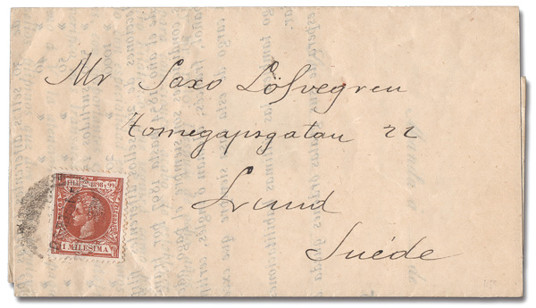 1898, King Alfonso XIII, 1m orange brown (Scott 192), tied by a blurry Manila c.d.s., Feb 11, 1898, on afl to Lund, Sweden; the letter, on an illustrated letterhead, is from a Manila Stamp Dealer, Luis Moreno Jerez, offering packets of Philippine stamps. is, Very Fine. Scott $500+. (Image)