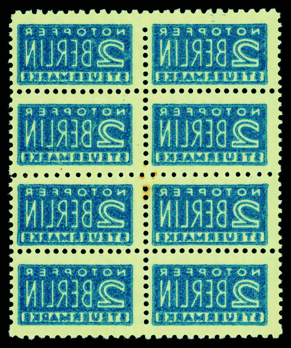 1948, 2pf blue Compulsory Surtax, printed on gum side (Michel 2 BB W G), vertical block of 8, o.g., never hinged, Fine to Very Fine. Michel €4,000 ($4,320). (Image)