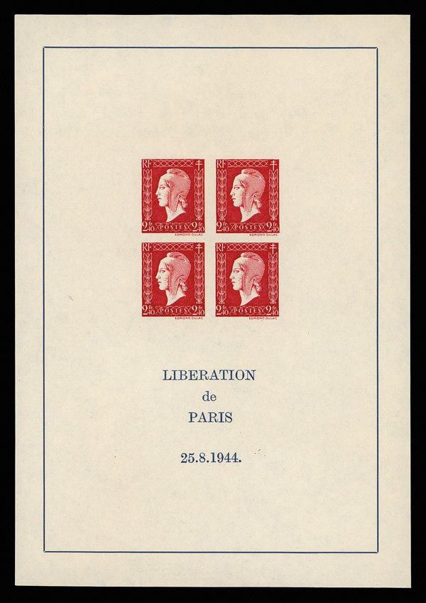 1944, 2.40Fr Marianne (Dulac), "Liberation de Paris" miniature sheet of four, unissued (Scott 515 var.), imperforate on 121 x 172mm pane, the stamps in bold color with crisp lines; "Liberation/de/Paris/25.8.1944." printed below; wartime paper fresh and clean, o.g., never hinged; top right corner wrinkled, otherwise Very Fine. See footnote in Scott after #523. Yvert BF 4; €9,300 ($10,040). Scott $6,500. (Image)