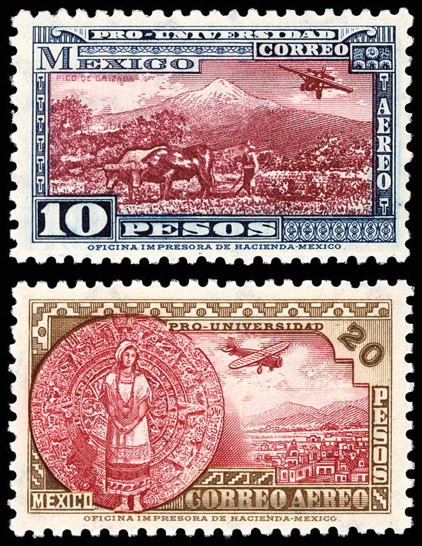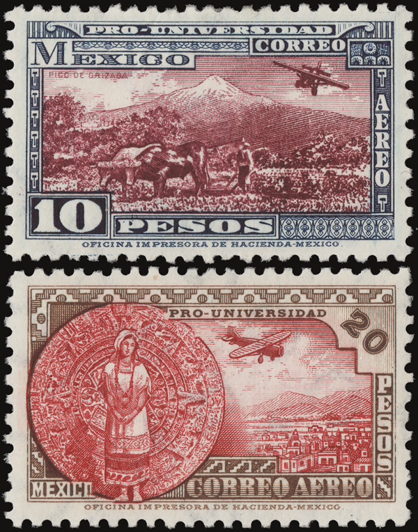 1934 National University, 10p & 20p (Scott C60-C61), a marvelous set of the two high values, o.g., lightly hinged, wonderfully fresh and beautifully centered, Extremely Fine. Issued quantities: 2,500 and 1,599, respectively. Scott $2,350. (Image)