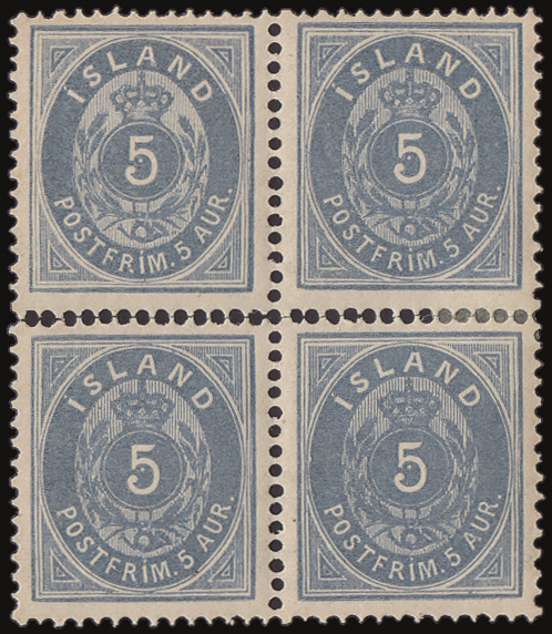 1878, Crowned Numeral, 5a blue, perf 14 x 13½ (Scott 9), a gorgeous, beautifully centered block of 4, which has become separated into two horizontal pairs, o.g., the lower left stamp never hinged, wonderfully fresh; rejoined with a small hinge between the two right stamps, Extremely Fine, with a 1999 Møller certificate as a block of 4. Michel 6A. Yvert 6A. Facit 9; SKr 24,500 ($2,380). Scott $2,225 as singles. (Image)
