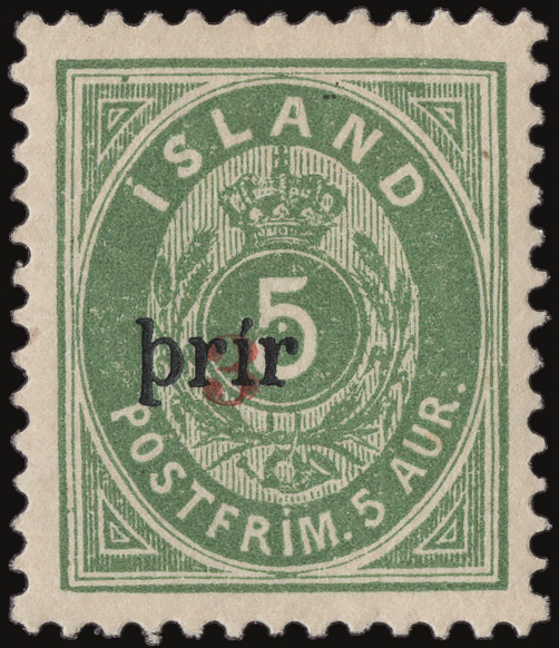 1897, Crowned Numeral surcharged, large "3 þrir" on 5a green, perf 12¾ (Scott 31), o.g., fresh and nicely centered; light handstamped signature on reverse, along with a small black ink spot, Very Fine, with a clear 1974 A.P.S. certificate. Michel 18 IB. Yvert 18a. Facit 35; SKr 800 ($80). Scott $875. (Image)