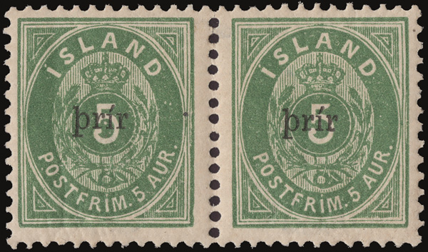 1897, Crowned Numeral surcharged, small "þrir" on 5a green (Scott 33A), a choice horizontal pair, o.g., lightly hinged, wonderfully fresh and well centered, Very Fine, with a 1998 Møller certificate. Michel 19 IIB. Yvert 19. Facit 36; SKr 15,000 as singles ($1,460). Scott $2,200 as singles. (Image)