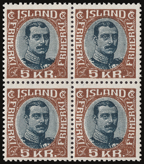 1920, King Christian X, 5kr brown & indigo (Scott 128), a lovely mint block of 4, o.g., never hinged, bright, fresh and well centered, Very Fine. Michel 98. Facit 144; SKr 10,000 as singles ($970). Scott $1,200 as singles. (Image)