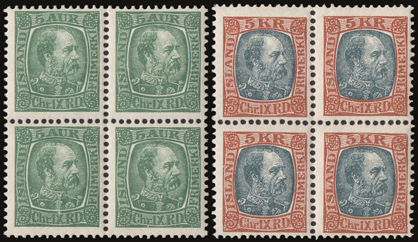 1902-04, King Christian IX, 3a to 5kr complete (Scott 34-44B), a choice set of mint blocks of 4, o.g., all with at least two stamps never hinged, some with three, including the 3kr; the key 5a completely never hinged, all bright and fresh, Fine to Very Fine. Michel 35-47. Yvert 34-46. Facit 63-75. Scott $2,758 as singles. (Image)