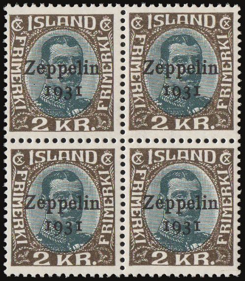 Airmail, 1931, Zeppelins complete (Scott C9-C11), a marvelous set of mint blocks of 4, o.g., never hinged, bright, fresh and unusually well centered, Very Fine. Michel 147-149. Facit 162-164; SKr 10,000 as singles ($970). Scott $860 as singles. (Image)