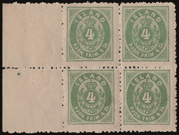 Official, 1873, 4sk green, perf 12½ (Scott O3), an exceptionally fresh left sheet margin block of 4 with paper maker's watermark in selvage, o.g., never hinged, bright a reasonably well centered for this, Fine to Very Fine. Michel 1B. Facit Tj3; SKr 15,000 as singles ($1,460). Scott $1,050 as singles. (Image)