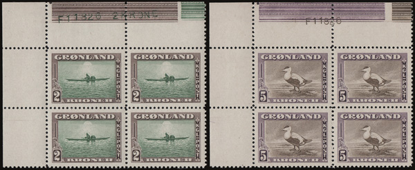 1944- 51, 50pi, £1 King Farouk "Military" Issue (Scott 269C-269D), matching Imperforate Royal Printing top left corner margin blocks of four with Arabic "Cancelled" on back side, without gum as issued, Very Fine and choice, just 50 of the 50pi and 100 of the £1 values were issued in this format; Nile Post D171b, D172c, $2,600. (Image)