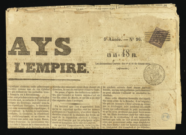 Newspaper Tax, 1853, 9c black on violet, "B.G." large (Scott PR1), tied by parallel lines obliterator on April 6, 1853 edition of "Le Pays / Jorunal De L'Empire" (printed in Paris); stamp with two full margins with dividing line at bottom; newspaper nearly complete, with section in center lost due to wear, Fine to Very Fine, very scarce, with 2012 Sismondo certificate. Sassone 1. Scott $3,100. (Image)
