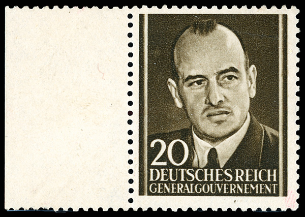 British Forgeries for Poland "Generalgouvernement", 1943, 20 (gr) sepia (Michel 33), left margin single showing Hans Frank (the German-appointed governor of occupied Poland), o.g., never hinged, fresh and Very Fine, a premium example with rubber-stamp signature on gum. Michel €4,500 ($4,860). (Image)