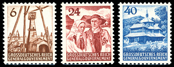 1944, 6(gr)-40(gr) Lands and People (Michel I-III), the unissued set of three, o.g., never hinged, fresh and Fine to Very Fine; the set was not authorized by the the German Post East in Krakow, but some were released from the state printing office in Vienna after the war. Michel €1,800 ($1,940). (Image)