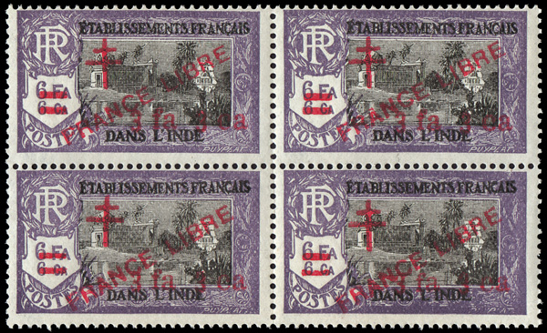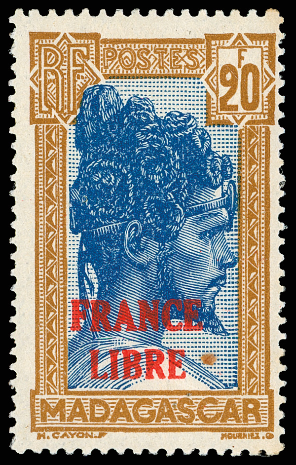 1942, 20fr yellow brown & dark blue, 'FRANCE LIBRE" overprint (Scott 228), o.g. with a bit of disturbance as usual, lightly hinged, particulalry fresh colors and nicely centered, Very Fine and choice example of this seldom offered high value, signed Brun and others, with 2023 Roumet certificate. Yvert 255A; €1,100 ($1,190). Scott $725. (Image)