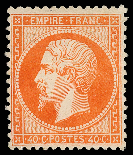 1862, Napoleon III perforated, 40c orange on yellowish (Scott 27), unblemished o.g., never hinged (rare thus), nicely centered with rich color, Very Fine and attractive, scarce this nice, signed Calves. Yvert 23; €2,900 ($3,130). Scott $1,500. (Image)