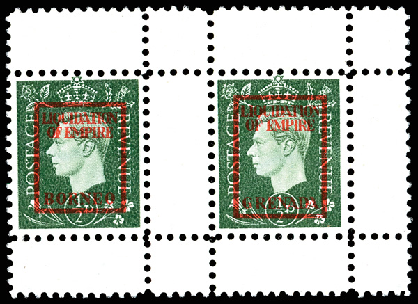 1944, ½d-3d KGV Forgery Set, "Liquidation of Empire, Borneo" Overprints, complete set of 6 without gum as issued, ½d horizontal gutter pair with gutter on 3 sides, rest singles, 1d & 2d with full top selvage and gutter at right, 1½d with gutters on 3 sides, 2½d with full top selvage and gutters on other 3 sides, Very Fine to Extremely Fine set, see the others online. Michel 9Vb-14Vb; €1,190 ($1,280). (Image)