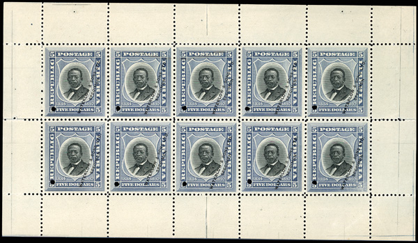 1893, $1, $2 & $5 Pictorials, Waterlow & Sons Perforated Trial Color Plate Proofs (Scott 47TC-49TC), miniautre sheets of 10, each stamp with small punch hole at bottom right and diagonal "Waterlow & Sons Ltd. Specimen" 2-line handstamp, $1 black & brown, $2 green (2; different type faces) and $5 black & blue (unissued colours) ungummed miniature sheets of 10, each stamp with security punch hole at bottom left and diagonal WATERLOW & SONS LTD. SPECIMEN' overprint at bottom right, without gum as issued, Very Fine. (Image)