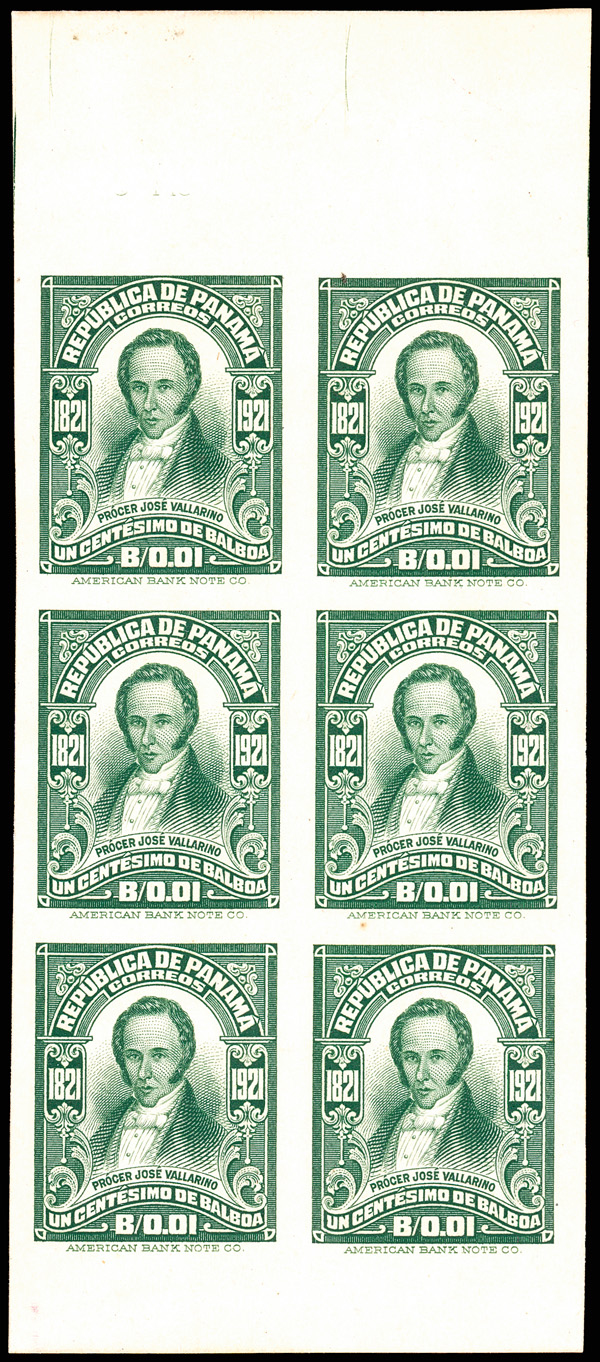 1921, 1c green Vallarino, plate proof on card (Scott 221P4), vertical block of 6 with selvage at top and bottom, fresh with intense color and expected razor-sharp detail; a couple tiny inclusions/toned spots noted strictly for accuracy, Very Fine, with 2020 P.S.E. certificate. (Image)