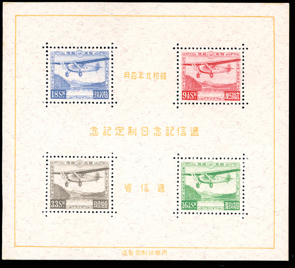 1934, Communications Day, souvenir sheet of 4 (Scott C8), o.g., never hinged, Post Office fresh and sound with bright colors and square corners; tiny (truly tiny) gum abrasions in the top right and bottom left corners, Extremely Fine to Superb, with 2023 P.S.E. certificate graded XF-SUP 95. J.S.C.A. C56. Scott $2,000. (Image)