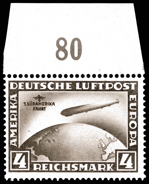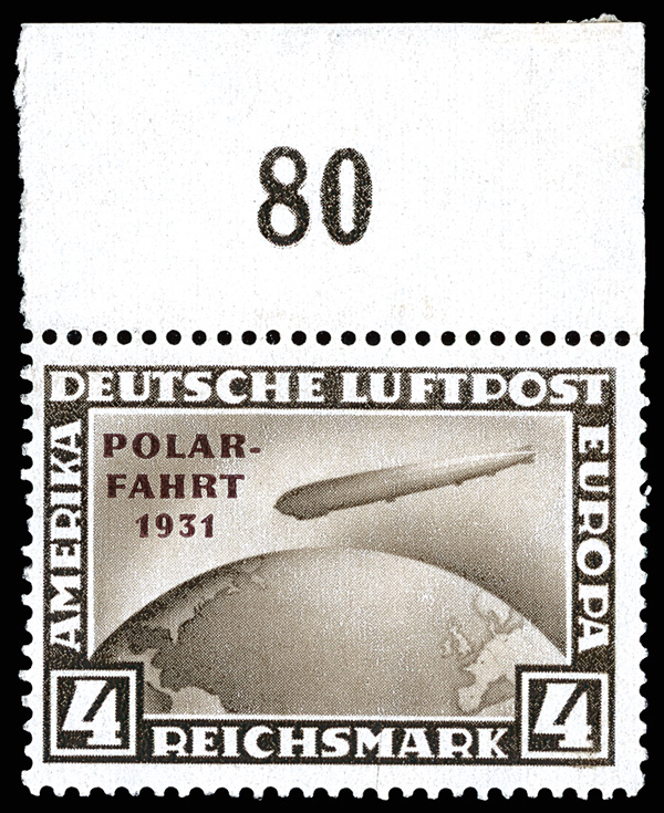 Airmail, 1931, 1m-4m Polar Flight Zeppelins complete (Scott C40-C42), o.g., stamps never hinged, hinged in selvage only, all top margin singles with accounting imprint (1M top left corner single), fresh and bright with pristine gum; 1M a few horizontal separations at right, Fine and better, each with 2023 P.S.E. certificate, #C40 graded F-VF 75, #C41 XF 90, #C42 F 70. Michel 456-458. Scott $3,250. (Image)