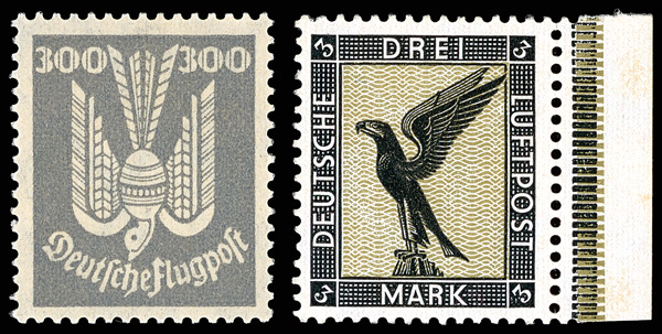 Airmail, 1924-27, 5pf-300pf Dove and 5pf-3m Eagle complete (Scott C20-C26, C27-C34), birds of a feather, all Post Office fresh with exceptional color and brightness, sound and solidly centered; a lovely flock, Very Fine overall, #C20-C26 each with 2024 P.F. certificate, #C27-C34 each with 2023 P.F. certificate less 2023 P.S.E.-certed #C29 (F-VF 75) and C31 (F 80). Michel 344X-350, 378-384. Scott $2,050. (Image)