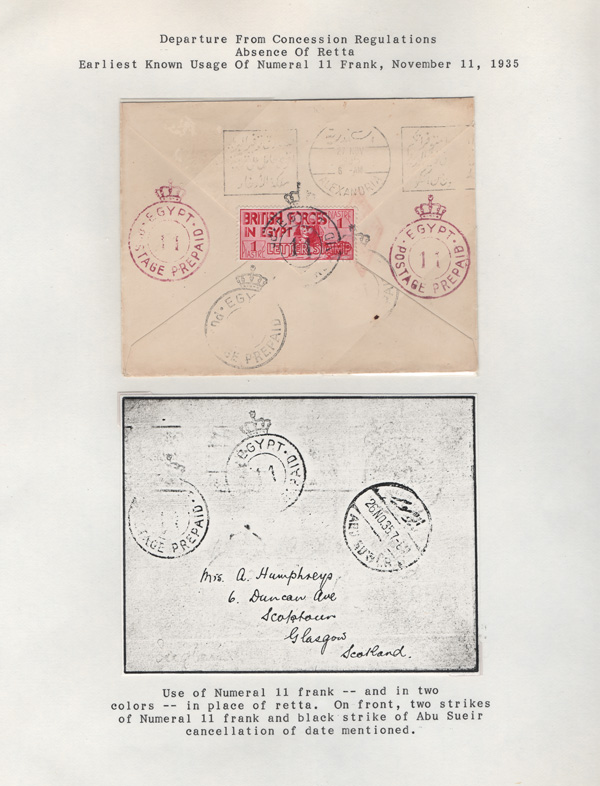 1934, Sphinx Letter Stamp, 1pi carmine, perf 14½ x 14, Small Collection (Scott M5), comprises one MLH single, three used singles and eight covers to the United Kingdom (two to Scotland), all with Crowned Circle franks including numbers 11 (the earliest known use - struck in both black & purple), 13 (2), 21, 22, 23 (2 including one properly franked but mistakenly charged 3d Postage Due upon arrival), and 24; all on Exhibition pages, generally F-VF. SG A7. Nile Post BF5. (Image)