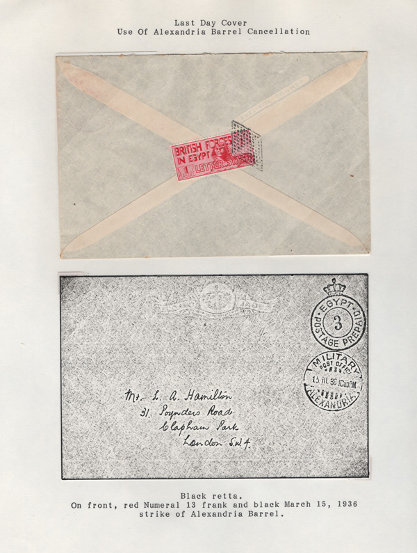 1935 (Dec), Sphinx Letter Stamp, 1pi carmine, perf 13½ x 14, Six covers (Scott M8), all mailed on the last day of validity, Mar 15, 1936, after the Issue of regular Egyptian Military Postage stamps, on March 1. The covers all bear a Crowned Circle numeral frank including #2 (M.P.O. Cairo), 3 (Alexandria Military Post Office), 4 (M.P.O. Moascar), 9 (M.P.O. Cairo, frank in purple), 10 (M.P.O. Port Said), and 14 (M.P.O. Abu Qir); all to England except numbers 2 & 9, which are addressed to Miss Mary Lloyd, Isle of Man, and are from the 50 Presentation Sets created on the last day of the Postal Concession for the U.P.U. and various dignitaries, including Kings Fuad and George V., Very Fine. SG A9. Nile Post BF8a. (Image)