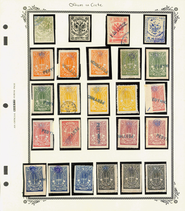 Russian Offices in Crete, Rethymno Issues Collection, 1899, attractive two-Scott page collection, mostly mint/unused but with a handful used (one with full 1899 double-ring cancel); stamps fresh and bright with most solidly centered, the imperfs four-margined, Very Fine overall, fully imaged online, a compilation difficult to duplicate today.(Image)