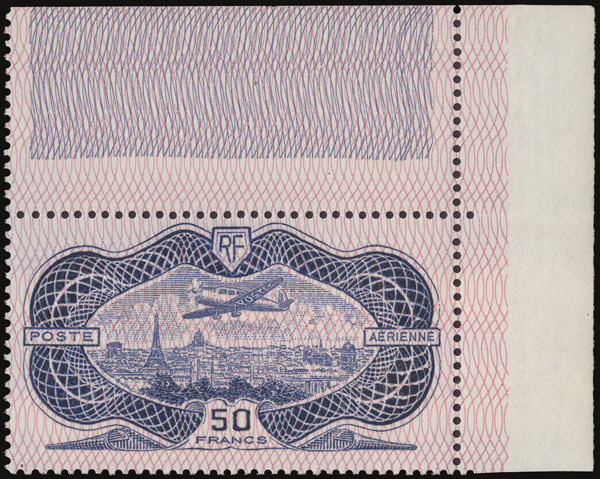 Airmail, 1936, 50fr "Banknote" (Scott C15), a gorgeous upper right corner sheet margin single, o.g., never hinged, Very Fine. Yvert 15. Scott $620+. (Image)