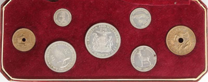 Rhodesia & Nyasaland 1955 7-coin proof set, the only one issued by this decade-long federation; two small coins bronze, others 50% silver; in original red case which has aging spots inside, the (7) coins not affected; 2,000 sets produced (KM# PS2 CV $250) (Image)