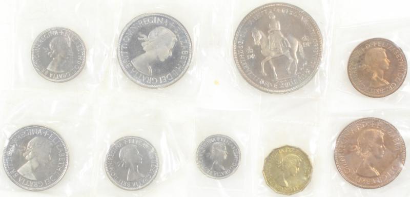 Great Britian 1953 Coronation proof set in original maroon box, each coin still in individual plastic wrap, unfortunately lacks the farthing but other (8) coins present, retaining proof luster; interior of box also clean (this tends to get spots) (Image)