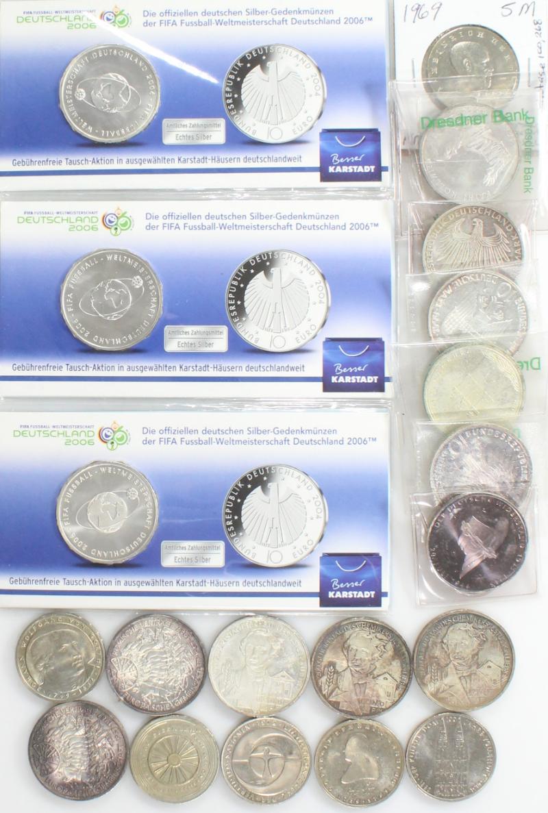 Germany - Selection (21) commemorative coins, (14) of which are silver; incl East Germany 5m 1969 Hertz Unc; West Germany 5 mark 1972, 1980 UNC, 1981, 1982, 1985; 10 mark (.3115 oz ea) 1972, 1987 (2), 1989, 1990, 1992 (2 diff), 1994; €10 (.5353 oz ea) 2003 von Liebig (3) & 2004 World Cup (3 in mint packaging); raw loose or in flips, some natural tarnish from storage (Image)