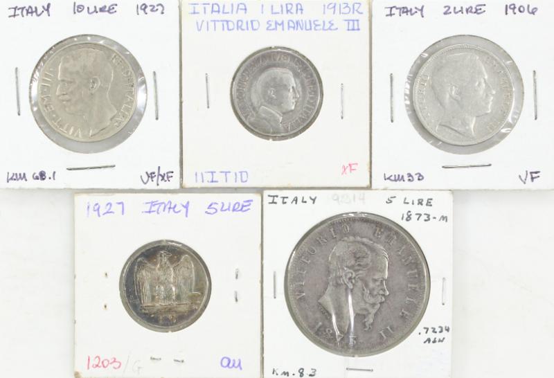 Italy (5) incl 1913 1L KM 45 XF, 1927-R 1L KM 67.1 AU, 1906 2L KM 33 VF, 1873-M 5L KM 8.3 VF+ & 1927 10L KM 68.1 XF. (Image)