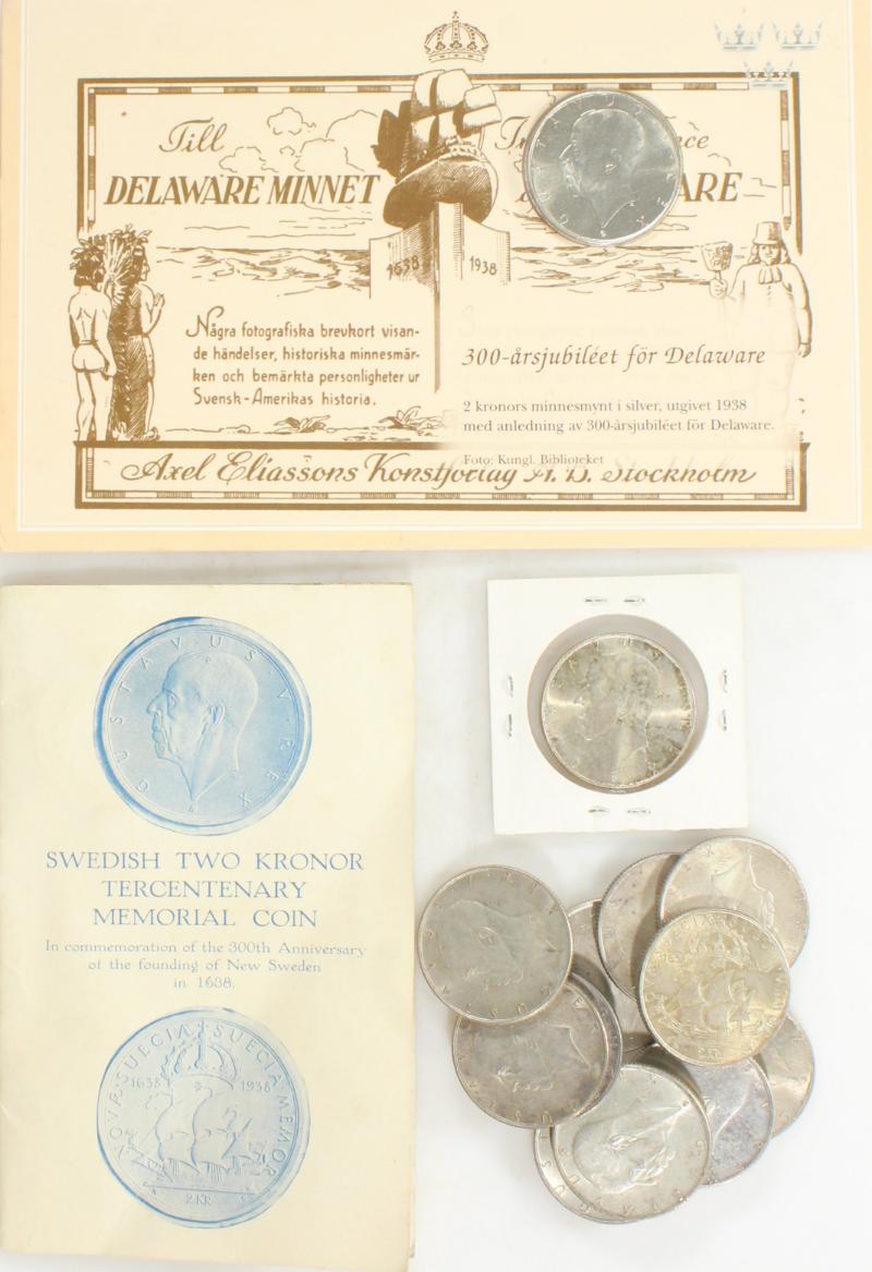 Sweden 1938 2kr silver commemorative New Sweden / Settlement of Delaware, (17) coins, one UNC in dealer holder, (4) in original holder from 1938 Tercentenary celebrations, others raw, mostly XF, over 6½ ounces silver. (Image)