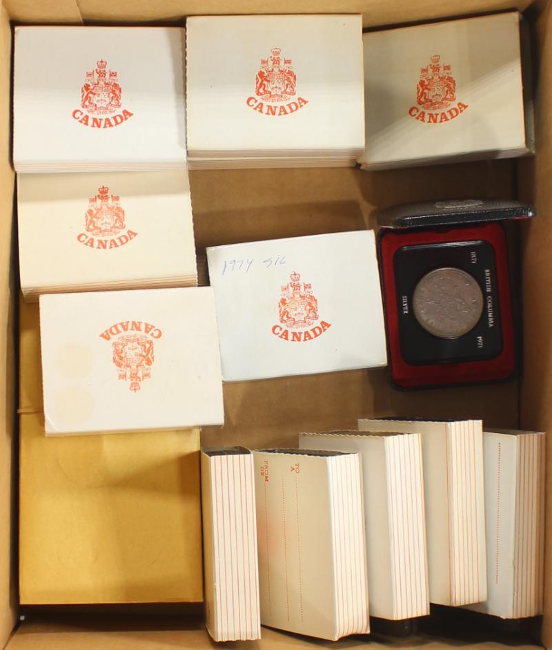 Canada silver items: (10) 1964 Unc sets in original envelopes; (14) specimen silver dollars in original black clamshells, 1971 BC (5), 1972 Voyageur (5), 1974 Winnipeg (2), 1975 Calgary & 1976 Library; some light natural tarnish, 5.25 oz ASW for the dollars only (Image)