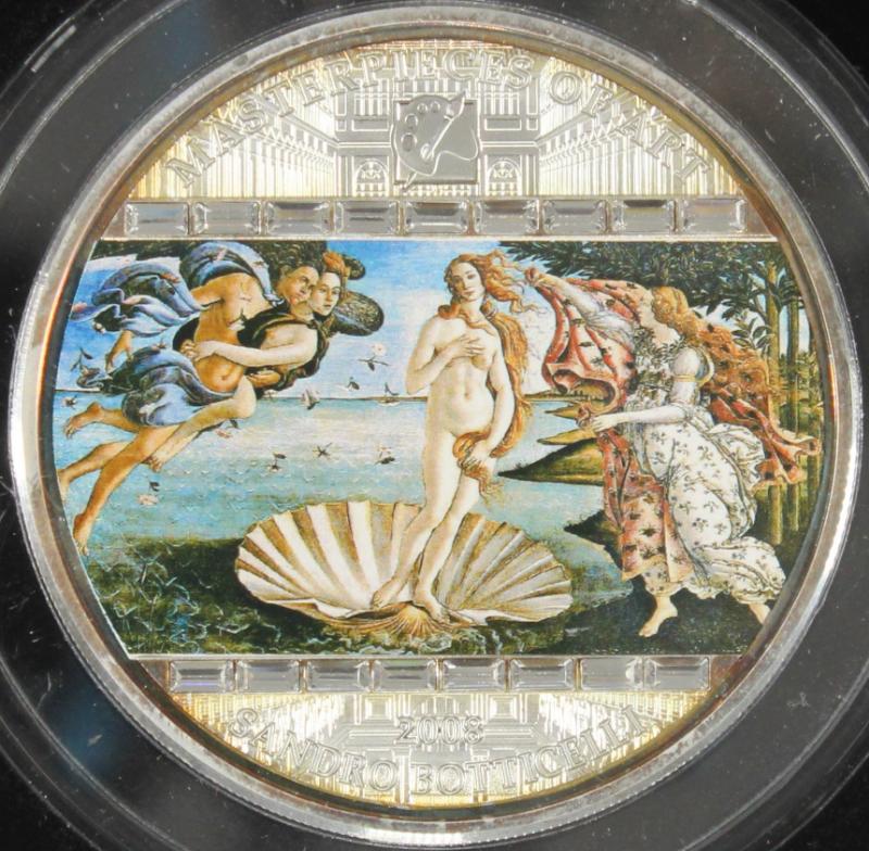Cook Islands 2008 Masterpieces of Art series $20 w/ colorized The Birth of Venus, 3 oz. fine silver w/ Swarovski crystal inserts; in original packaging w/ papers, only 1,458 minted (KM# 639) (Image)