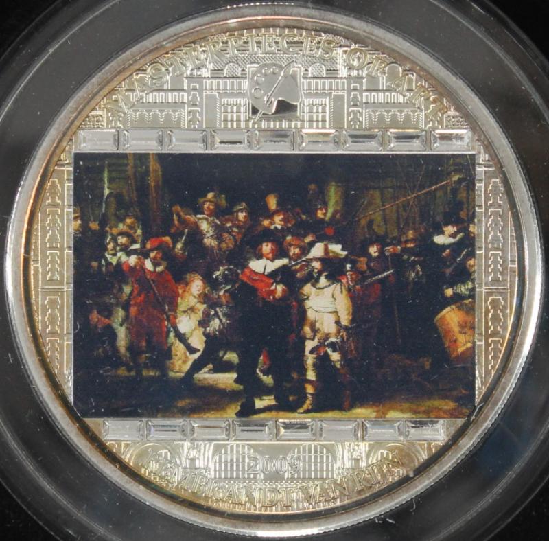 Cook Islands 2009 Masterpieces of Art series $20 w/ colorized The Night Watch by Rembrandt and Swarovski crystal inlay, in original packaging w/ papers, 3 oz. fine silver, only 1,642 minted (KM# 698) (Image)