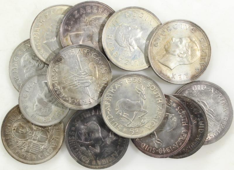 South Africa silver coins obtained by owner in country at the time; 2½sh 1955; 5sh 1947-48, 1950, 1952 (3), 1956-58; 50 cents 1961, 1964; bonus Southern Rhodesia crown 1953 (2); a few circ but most XF-MS w/ some natural tarnish; total 6.9555 oz ASW (Image)