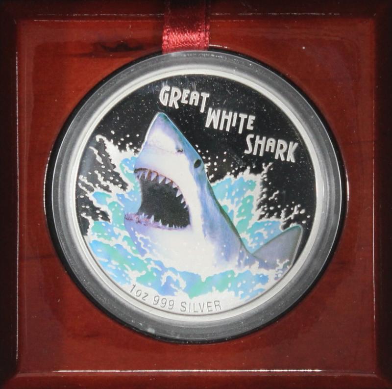 Tuvalu 2007 $1 Great White Shark 1 oz. fine silver colorized coin in wooden display box w/ paper, #3667 / 5000, a popular coin (KM# 62) (Image)