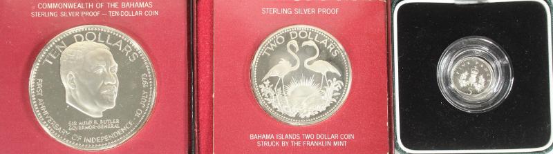 Selection (8) WW silver commems: Bahamas 1973 $10 Independence & 1974 $2 Flamingo (in FM packaging); Cook Islands 1988 $50 Ponce de Leon; West Germany 1972-D 10m Olympics; GB 1990 5p piedfort; Netherlands 2003 €5 van Gogh; Poland 1980 200z Winter Olympics; Turks & Caicos 1974 20 crowns Churchill; Unc & Proof, total 5.4424 oz ASW (Image)