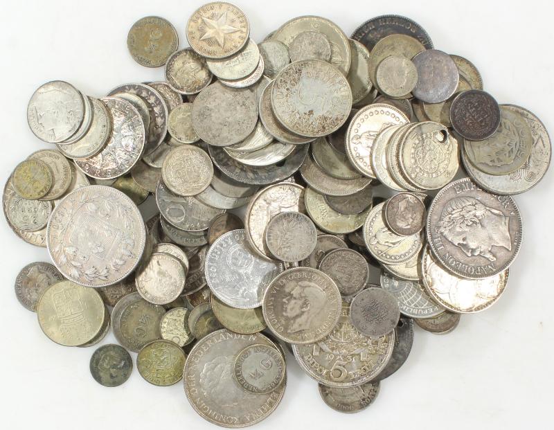 Baggie of loose WW silver coins of all sizes; baggie weighs 1 lb 13 oz, different purities; coins range from mid-19th to mid-20th centuries, from tiny Dutch & Swedish coins to large size incl Latvia 1931 5 lati, Netherlands 1939 2½g, Greece 1963 30d map & 1964 wedding (2); France 1830 5fr, Austria 1967 50sh, Germany 1938-A 5m, Sweden 1950 2kr; other countries incl Venezuela, Portugal, New Zealand, India, etc (no GB, Canada, Mexico); mostly F to VF w/ some worn, couple w/ holes (Image)