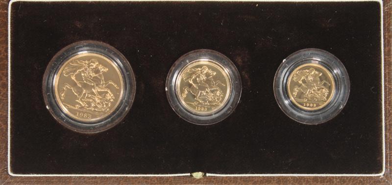 Great Britain 1983 Gold Proof Collection in orig box w/ papers. Contains £2 (16g), Sovereign (8g), & Half-Sovereign (4g) all Gem Proof. (The fineness is .917 and the ensemble has an AGW of .825 ozt) (Image)