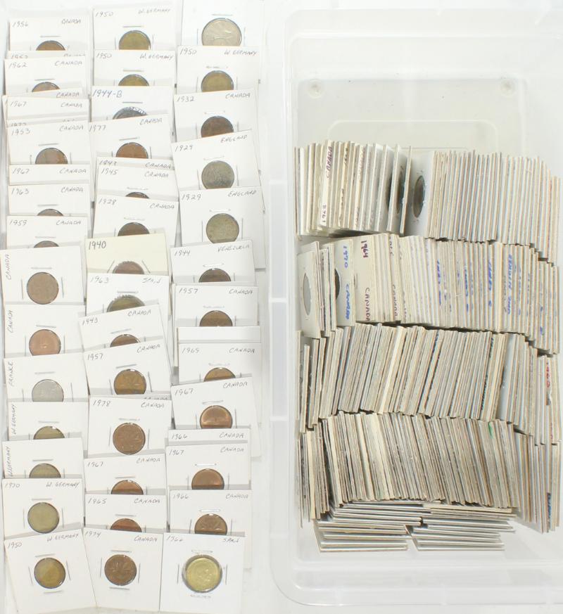 Several (100) in 2x2s or paper flips; small tub w/ mostly commons 20th cent w/ much Canada & GB; red box w/ more variety incl Ireland, much Israel, India, Hong Kong, more; finally, abt (11) plastic pages holding 2x2s, noted Germany, cash, Japan, France, tokens, Switz, Russia, one Danish West Indies, and several other older among the more common 20th cent; a good variety w/ some duplication, worn to Unc (Image)