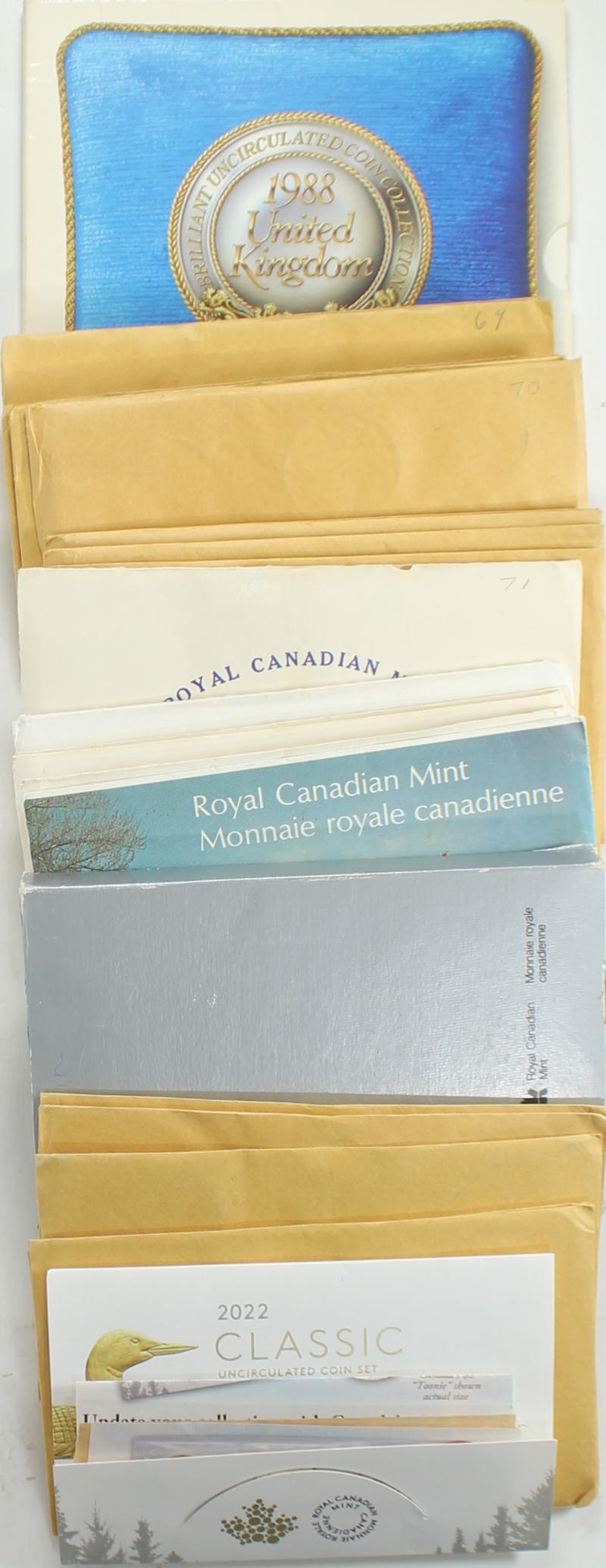 SETS Assortment of WW official coin sets; South Africa 1968; Zambia 1978 proof; Netherlands 1987 Unc; Bermuda 1970 proof & Unc; Germany 2002-A euro set; Israel 1968 & 1985 Unc; Panama 1968 proof (PS6 CV $80); GB 1970 (2) proof, 1988 Unc, 1993 proof; Canada proof 1971 & 1988; Unc 1967 (2), 1968 (3), 1969 (5), 1970 (5), 1971 (5), 1974, 2022; also (5) sets in cellophane w/o outer envelope: Jamaica 1969 (2), New Zealand 1965 & 1969; also a few unofficial dealer made sets Bermuda, GB (£sd to decimal), SBA dollars, Luxembourg euro; most XF w/ a few having light damage to outer packaging (Image)