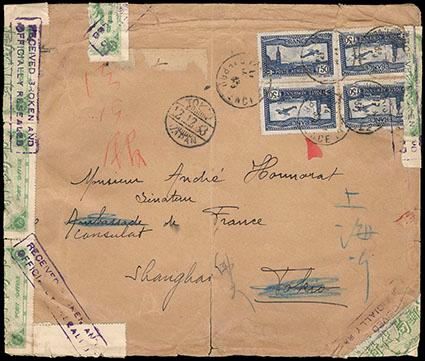 Worldwide, Salvaged Covers, 1907-1937. Two covers and a cover front, Gold Coast, 1907, KEVII 1p pair on 1p entire front from Axim to London, two line "Salved From SS Jebba" in purple below, France, 1933, 1.50Fr airmail block of four canceled with indistinct cds, addressed to Tokyo then forwarded to Shanghai, Tokyo receiving cds at left, Chinese Officially Sealed labels around the edge and tied with boxed cancel reading "Received Broken and Officially Re-Sealed" in purple, Egypt, 1937 legal sized cover from Cairo to London, stamps have floated off, boxed "Damaged By Sea Water" in purple, manuscript "In Disaster to Air Liner in Aegean Sea Sept 1937" below, condition is mixed as expected, a very interesting trio. Estimate; $150 - 200.