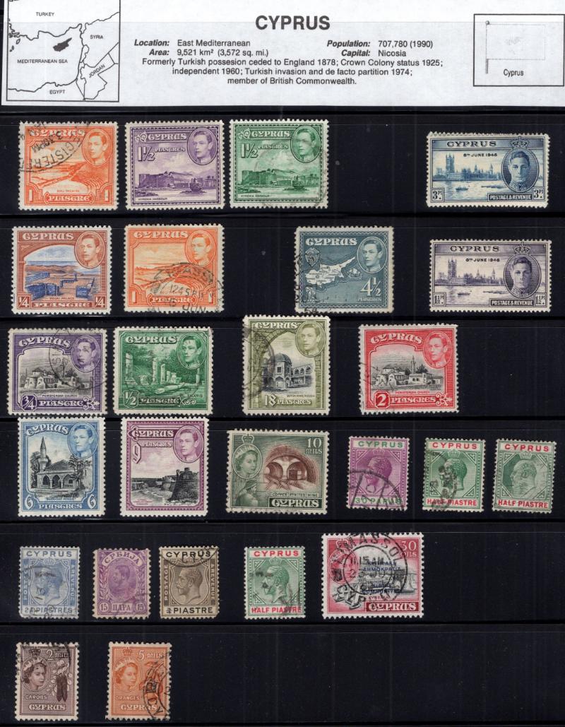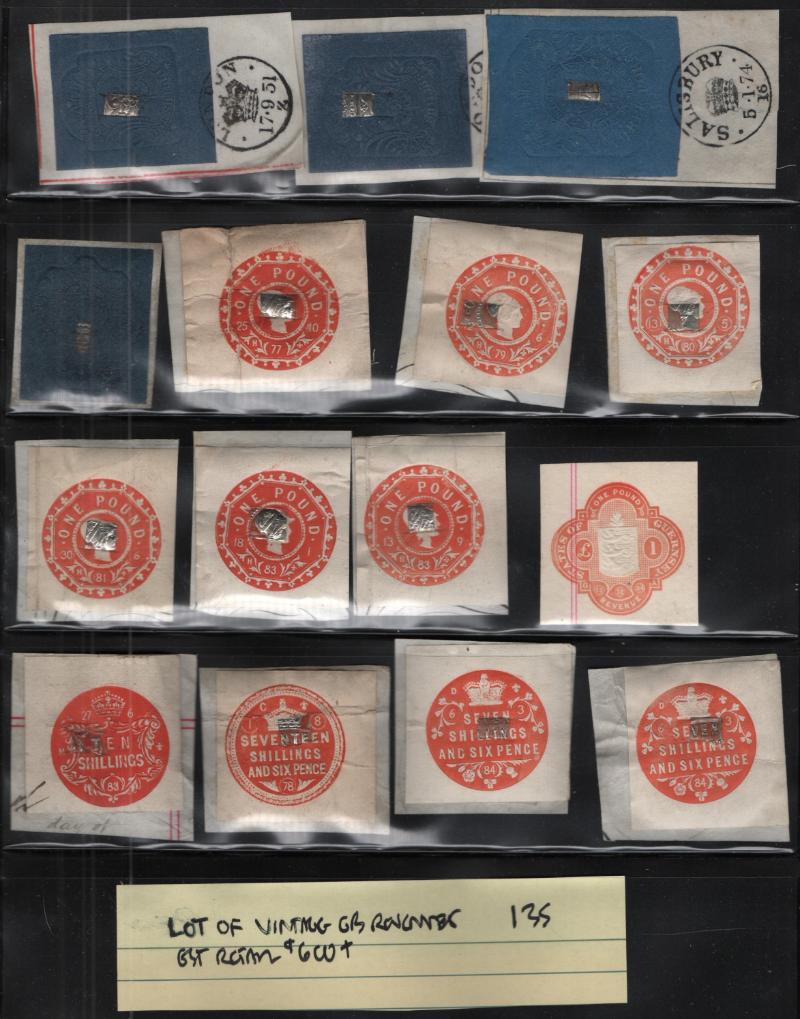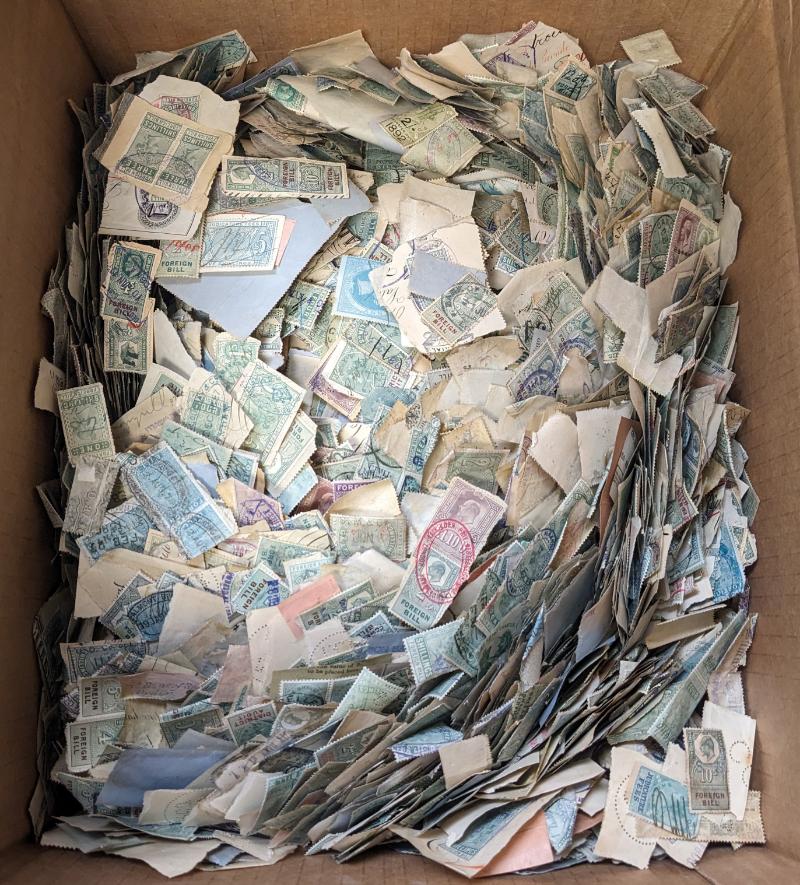 Accum abt (500+) revenues on 102 cards & in glassines, abt (100+) embossed British revenues from 1sh to £3 w/ diff year dates on stkpgs, abt (40+) revenues on documents & bank checks, better British Asia & much more; some dup, owner's retail value $2,000 (NV); few flts but gen F-VF (Image)