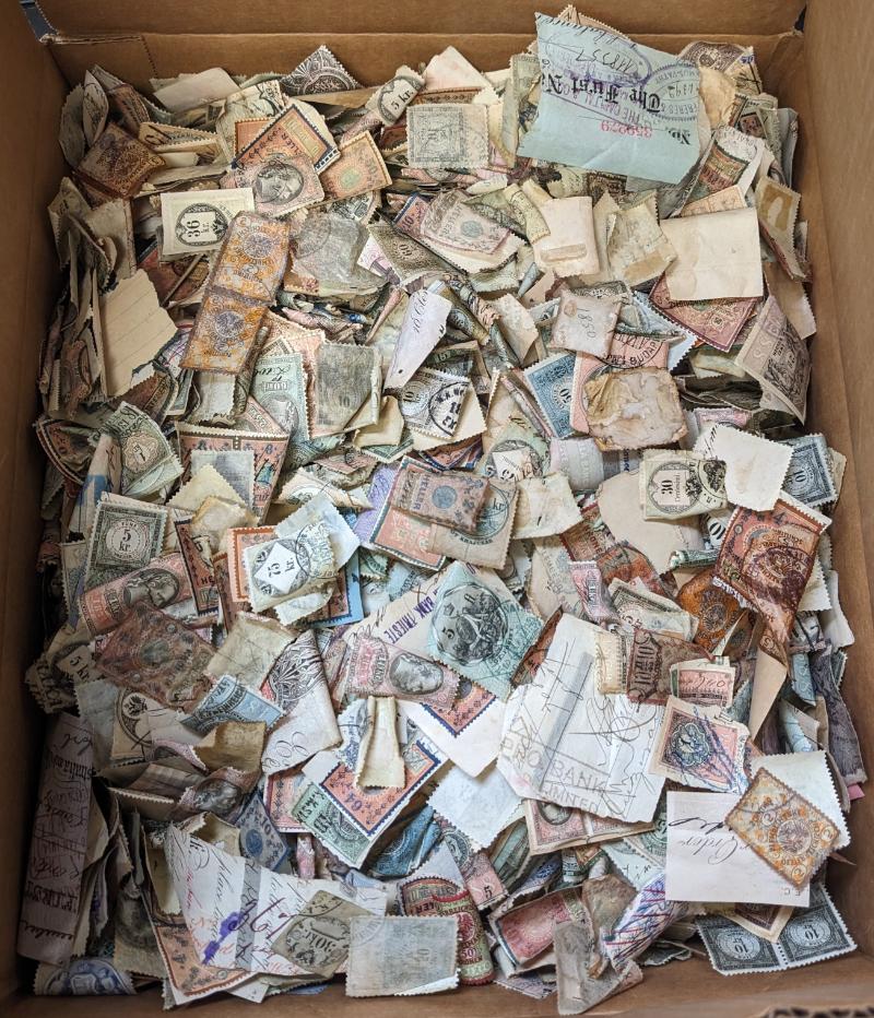 Accum abt (1750+) WW revenues, seals & labels 19th/early 20th Cent on stkpgs, glassines & 102 cards, large group scrap Argentina tax stamps, also much British & Philippines revenues, most CV $3 - $5 ea, some light dup, few flts but gen F-VF H/NH (Image)