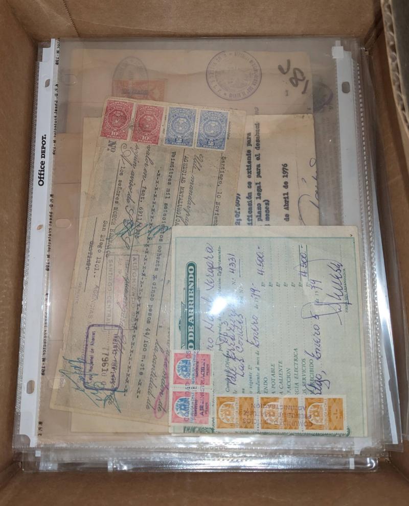 Accum abt (60) WW revenues on documents, receipts & a few checks; mainly from Chile w/ some from Cuba & Mexico, 19th/early 20th Cent, all sleeved; few flts to F-VF mixed cond (Image)